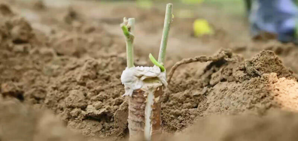“一定讓營養(yǎng)面朝外,讓它倆接上。因為它水分大,這棵樹最好活了。裹起來,圍嚴(yán)實,不叫它進(jìn)土。一會把它埋上。它不需要開花,冒一點就有果?!胰铀睦钗迥?,當(dāng)年椹子比蜜甜?!粫阉陨?。”