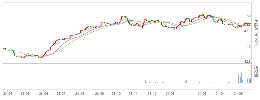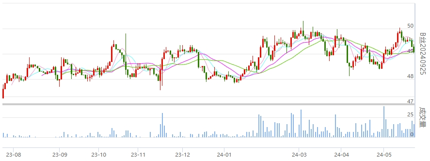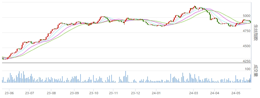 今日(周四)盤面生絲各遠(yuǎn)近合約價(jià)格繼續(xù)有所收跌。今日是240525生絲合約的最后交易日,今日下跌2700元終盤報(bào)收于48.72萬元。