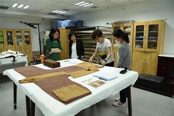南京云錦研究所文物修復(fù)部主任楊冀元(右二)在湖南博物院交付此次的仿制品。(受訪者供圖)
