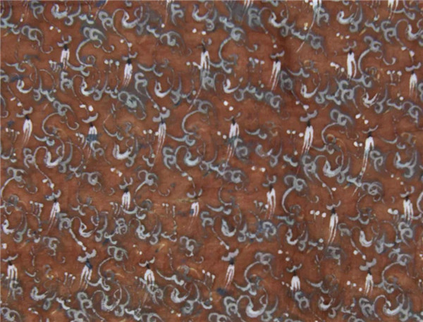 專家推測,枝蔓部分的印紋細(xì)密、分布均勻、交叉處有明顯斷紋,說明這是用鏤空版印制而成。而花、葉及蓓蕾部分的紋樣各不相同,色彩有濃有淡,應(yīng)是手工一筆一筆畫上去的。