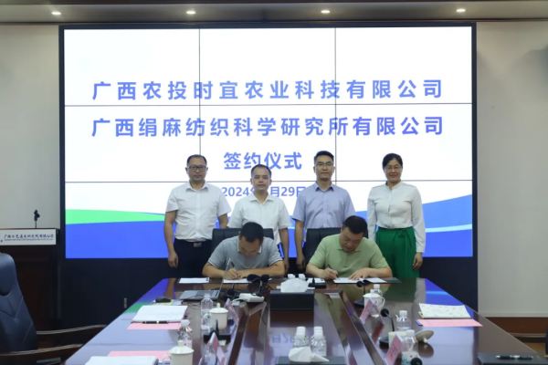 5月29日,廣西絹麻紡織科學研究所有限公司與廣西農(nóng)投時宜農(nóng)業(yè)科技有限公司簽署戰(zhàn)略合作框架協(xié)議。廣西工美院黨委書記、董事長,絹麻所黨支部書記、執(zhí)行董事,服裝所黨支部書記、董事長黃鳳敏,廣西農(nóng)投集團協(xié)同合作部部長石宏平見證簽約,工美院黨委委員,廣西絹麻所總經(jīng)理、黨支部副書記陳存嚴,廣西農(nóng)投時宜公司總經(jīng)理陳國民代表雙方進行簽約。