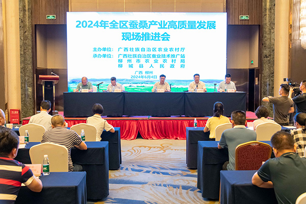 6月4日,由自治區(qū)農(nóng)業(yè)農(nóng)村廳主辦,廣西蠶業(yè)技術(shù)推廣站、柳州市農(nóng)業(yè)農(nóng)村局和柳城縣人民政府共同承辦的全區(qū)蠶桑產(chǎn)業(yè)高質(zhì)量發(fā)展現(xiàn)場(chǎng)推進(jìn)會(huì)在柳州市召開(kāi)。自治區(qū)農(nóng)業(yè)農(nóng)村廳副廳長(zhǎng)、黨組成員韋波出席會(huì)議并講話。柳州市副市長(zhǎng)湯振國(guó)在會(huì)上致辭。自治區(qū)農(nóng)業(yè)農(nóng)村廳、國(guó)家統(tǒng)計(jì)局廣西調(diào)查總隊(duì)、自治區(qū)工業(yè)和信息化廳相關(guān)部門(mén)業(yè)務(wù)負(fù)責(zé)同志;南寧市、柳州市、百色市、河池市、來(lái)賓市5個(gè)市農(nóng)業(yè)農(nóng)村局主要負(fù)責(zé)同志;蠶桑產(chǎn)業(yè)5個(gè)重點(diǎn)市和10個(gè)重點(diǎn)縣(市、區(qū))農(nóng)業(yè)農(nóng)村局負(fù)責(zé)人;12個(gè)市和51個(gè)主產(chǎn)縣(市、區(qū))蠶業(yè)站(或農(nóng)業(yè)推廣站等)負(fù)責(zé)人,廣西繭絲綢行業(yè)協(xié)會(huì)以及廣西蠶業(yè)技術(shù)推廣站相關(guān)人員,新聞媒體記者等,共130多人參加會(huì)議。廣西蠶業(yè)技術(shù)推廣站副站長(zhǎng)韋偉主持會(huì)議。