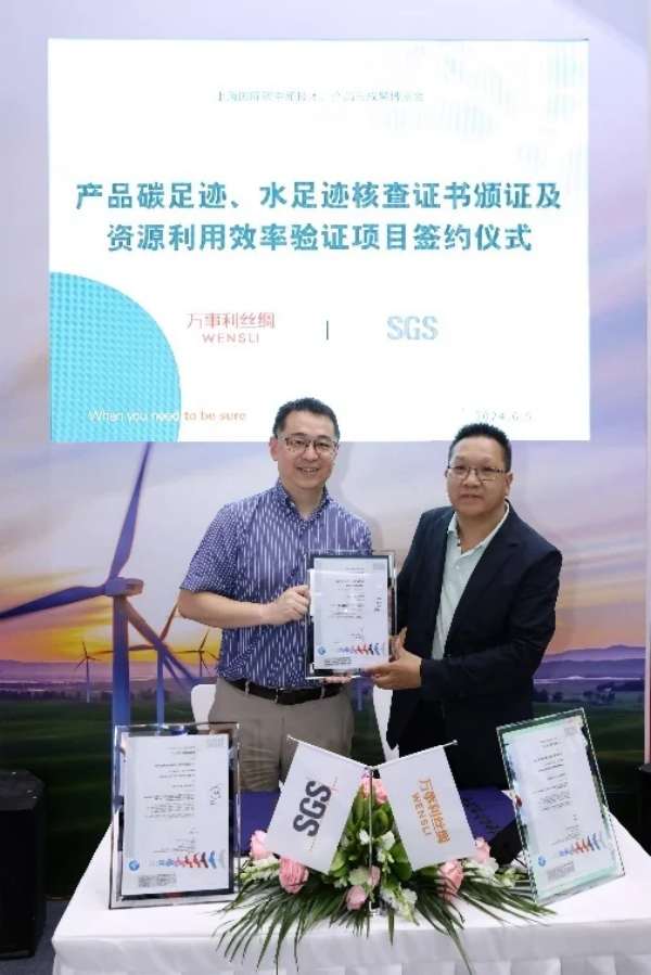 6月5日,在“上海國際碳中和技術(shù)、產(chǎn)品與成果博覽會”期間,SGS與杭州萬事利絲綢文化股份有限公司(以下簡稱“萬事利絲綢”)在上海新國際博覽中心E2館A05展位舉行產(chǎn)品碳足跡、水足跡核查證書頒證及資源利用效率驗(yàn)證項(xiàng)目簽約儀式。