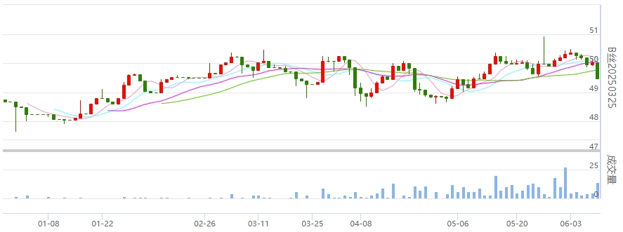 今日(2024年06月11日,周二)中國繭絲綢交易市場生絲電子指數(shù)下跌0.33%報于4925.70點。B絲(商檢4A級生絲):240625合約下跌0.12萬元報收于49.08萬元;240925合約下跌0.42萬元報收于48.84萬元;250325合約下跌0.57萬元報收于49.47萬元。