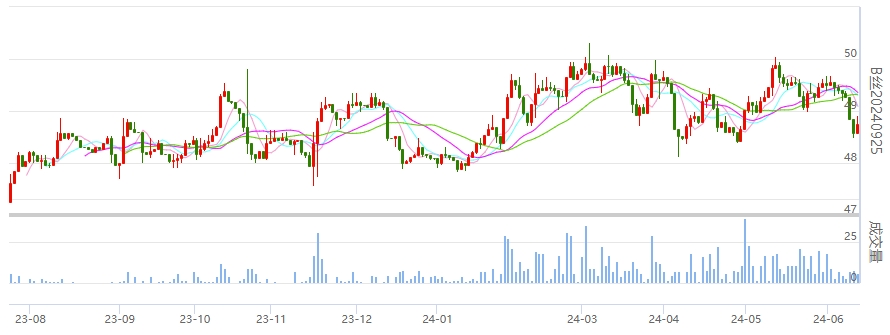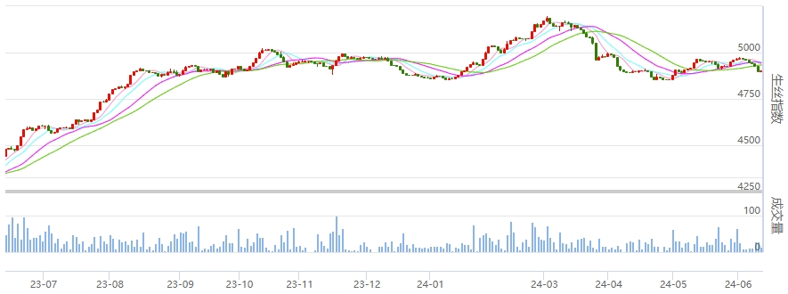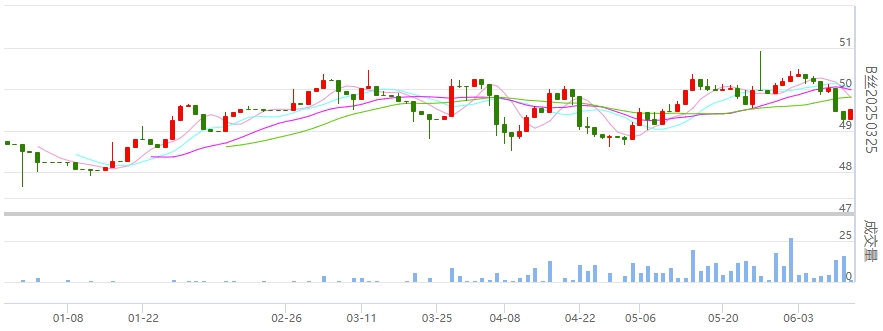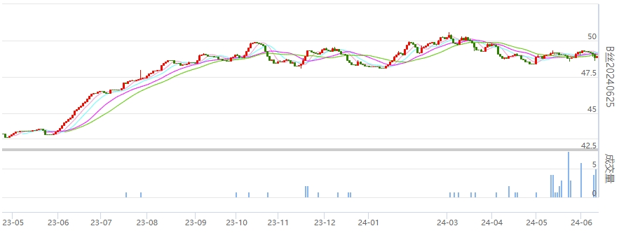 今日(2024年06月13日,周四)中國繭絲綢交易市場生絲電子指數(shù)上漲0.15%報于4905.48點。B絲(商檢4A級生絲):240625合約上漲0.09萬元報收于48.96萬元;240925合約上漲0.18萬元報收于48.75萬元;250325合約上漲0.24萬元報收于49.53萬元。