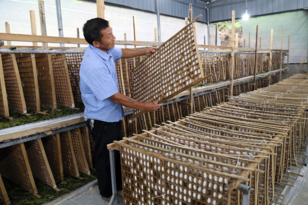 養(yǎng)蠶大戶熊國安查看成熟的蠶繭