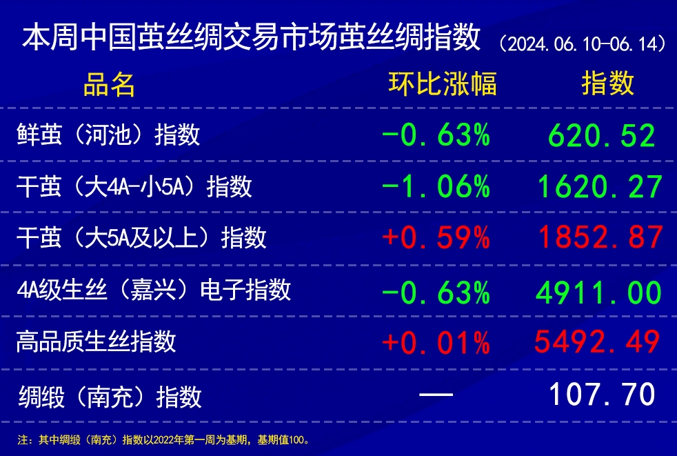 鮮繭指數(shù)上,本周廣西春夏繭收購價(jià)格環(huán)比上周有下調(diào),同時(shí)由于夏季因素質(zhì)量轉(zhuǎn)差;同時(shí)繼續(xù)跨區(qū)收購。本周指數(shù)環(huán)比上周下跌0.63%報(bào)620.52點(diǎn)。