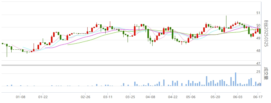 今日(2024年06月18日,周二)中國繭絲綢交易市場生絲電子指數(shù)微跌0.06%報于4913.62點。B絲(商檢4A級生絲):240625合約上漲0.09萬元報收于49.20萬元;240925合約下跌0.33萬元報收于48.78萬元;250325合約下跌0.39萬元報收于49.50萬元。