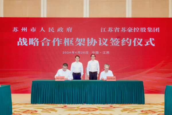 6月26日,蘇豪控股集團與蘇州市人民政府戰(zhàn)略合作框架協(xié)議簽約儀式在南京舉行,雙方將進一步加強合作交流,推進互利共贏。蘇州市委副書記、市長吳慶文,蘇豪控股集團黨委書記、董事長周勇致辭并見證簽約。蘇州市委常委、副市長唐曉東,蘇豪控股集團總裁、黨委副書記陳述代表雙方簽署戰(zhàn)略合作框架協(xié)議。蘇豪控股集團黨委委員、副總裁丁海參加活動。