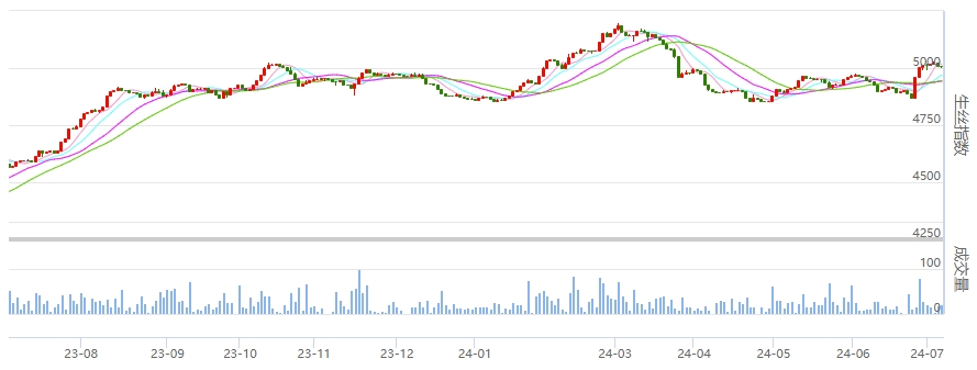 在上周三國儲收絲公告,盤面連續(xù)三根陽線后,本周盤面連續(xù)消化整理,生絲指數(shù)本周累計微跌0.16%報收于5007.9點。