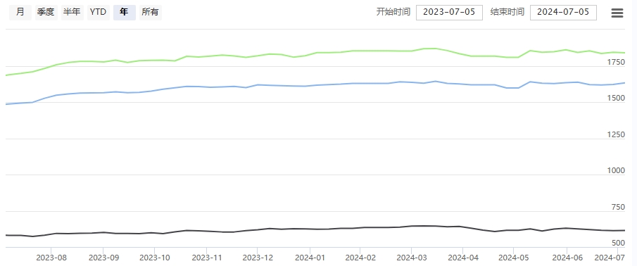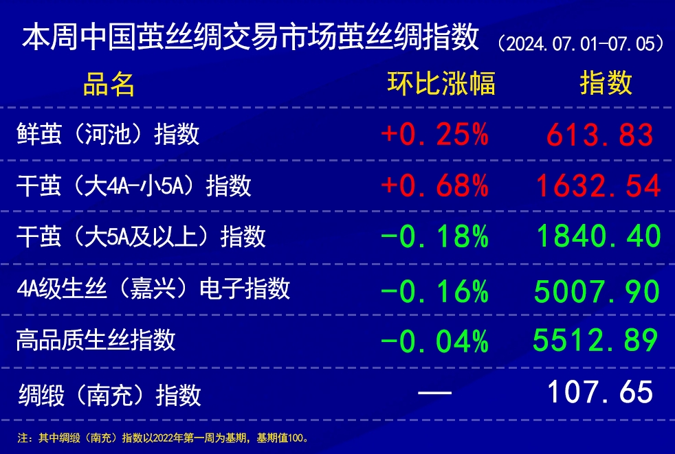 干繭指數(shù)上,上周三收儲公告后,干繭成交價格有所提高,同時,本周處于四川等地的初夏繭和春二繭的上市收烘期,買賣成交要等到7月中下旬,這樣干繭貿(mào)易量就較上周下降。同時,本周有少部分收烘數(shù)據(jù)。綜合轉(zhuǎn)換后,大5A及以上等級的干繭價格指數(shù)略收綠,大4A到小5A等級的干繭價格指數(shù)略收紅。