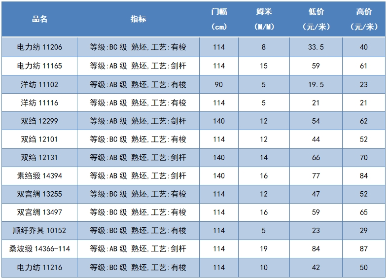 本周綢緞指數(shù)協(xié)作單位成交價格區(qū)間