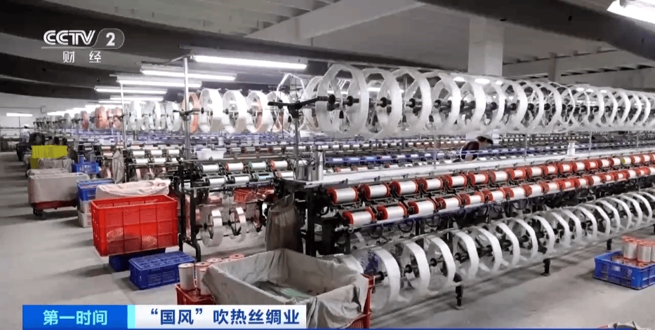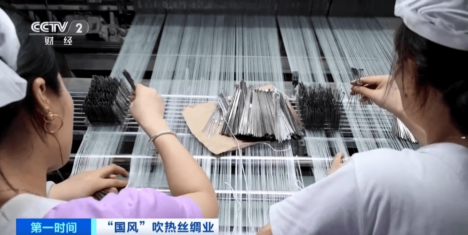 面料門店的負(fù)責(zé)人表示,他們主要將生絲加工成提花面料,自從“國(guó)風(fēng)”服飾流行以來(lái),提花面料的訂單已經(jīng)排到年底。在江蘇海安一家絲綢企業(yè)的生產(chǎn)車間,記者同樣看到了一片忙碌的景象。