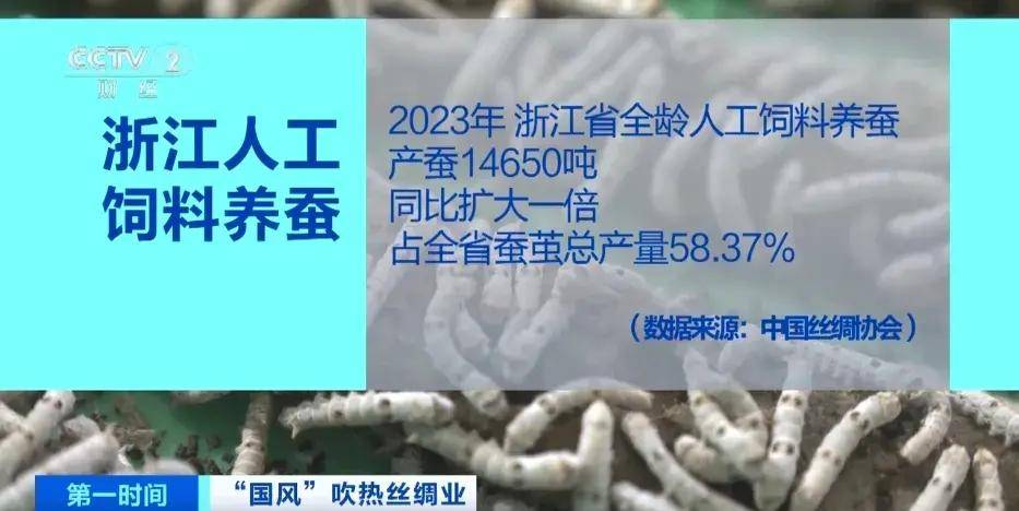 數(shù)據(jù)顯示,2023年,浙江省全齡人工飼料養(yǎng)蠶產(chǎn)蠶14650噸,同比擴(kuò)大一倍,占全省蠶繭總產(chǎn)量的58.37%。業(yè)內(nèi)人士表示,目前,人工飼料養(yǎng)蠶已初具規(guī)模,隨著技術(shù)不斷進(jìn)步,未來(lái)產(chǎn)量有望進(jìn)一步提升。