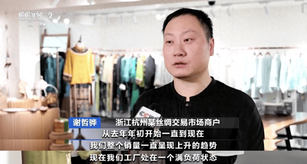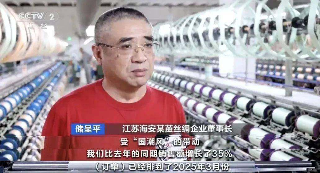 江蘇海安某繭絲綢企業(yè)董事長(zhǎng) 儲(chǔ)呈平:受“國(guó)潮風(fēng)”的帶動(dòng),我們比去年同期銷售份額增長(zhǎng)了35%,訂單已經(jīng)排到了2025年3月份。