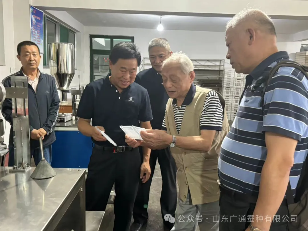 7月8日,時年94歲高齡的浙江大學蠶桑專家馮家新教授到廣通集團傳經送寶,廣通集團連海剛、房德文、閻跟東、黃海業(yè)等有關人員陪同。馮教授一行分別到正在飼育中的人工飼料車間和蠶種冷庫就飼料養(yǎng)蠶、蠶種浸酸、整理、冷藏情況進行參觀指導。通過現(xiàn)場參觀,馮教授對廣通集團近年來在蠶桑產業(yè)中的快速發(fā)展表示了充分的肯定。