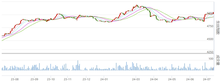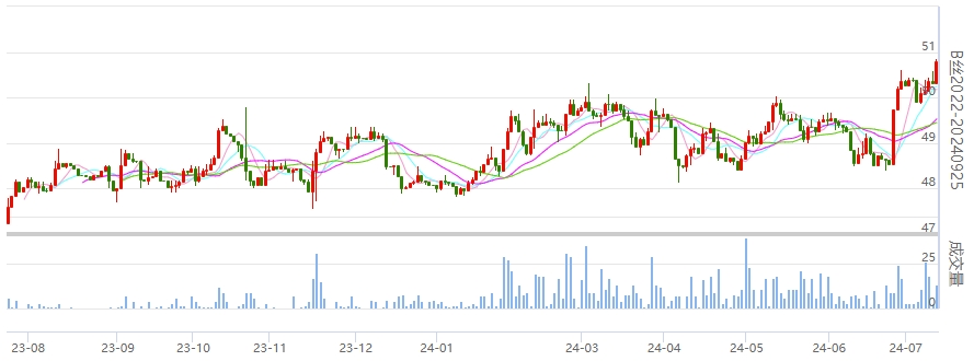 20/22D商檢4A級生絲:今日(周四)盤面各遠近合約有不同程度收漲,成交較昨日放大些,主力240925合約倉量略減,250325合約則增加些。生絲指數(shù)技術上,沿著5日均線日K線有所上行,同時RSI指標有所超買。