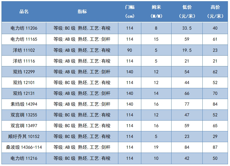本周綢緞指數(shù)協(xié)作單位成交價格區(qū)間
