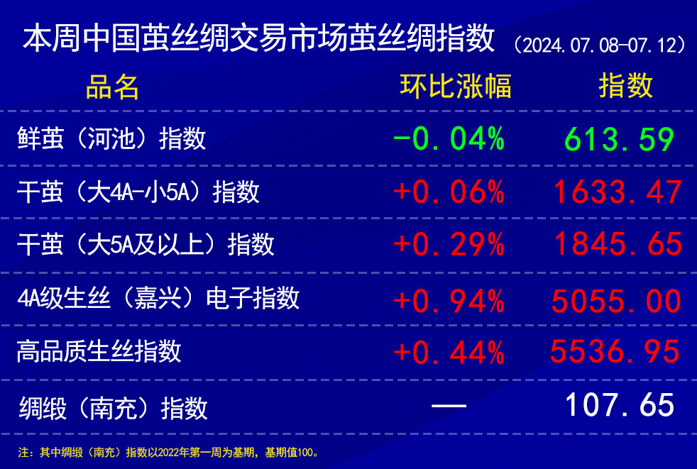 高品質生絲指數(shù)上,本周部分協(xié)作單位價格有所上調,帶動指數(shù)上漲0.44%。