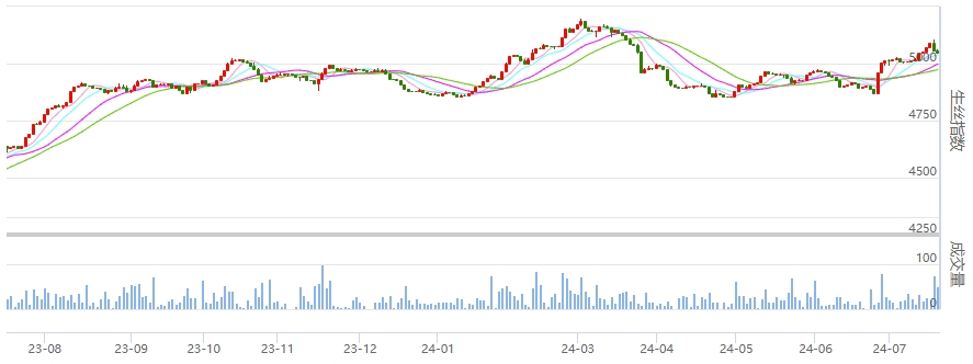 今日(周三)生絲盤面承接昨日走勢,各遠近合約價格繼續(xù)有不同程度下跌,下午中尾盤有一定回拉。主力合約240925和250325今日有不同程度的增倉。