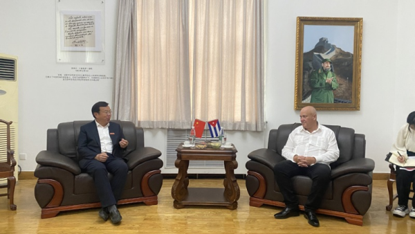 7月15日,來(lái)華出席全球共享發(fā)展行動(dòng)論壇第二屆高級(jí)別會(huì)議的古巴副總理塔皮亞在古巴駐華大使館會(huì)見(jiàn)江蘇科技大學(xué)黨委書(shū)記周南平。