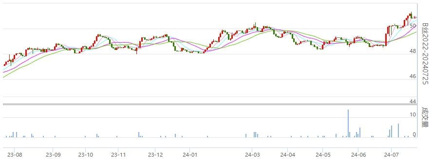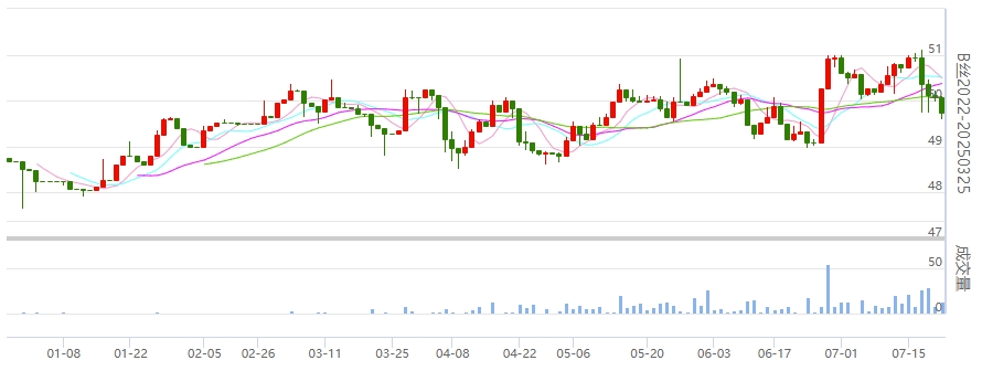 今日(2024年07月22日,周一)中國繭絲綢交易市場生絲電子指數(shù)下跌0.28%報5021.66點。B絲2022D(商檢4A級生絲):240725合約報平收于50.88萬元;240925合約下跌0.27萬元報收于49.80萬元;250325合約下跌0.33萬元報收于49.74萬元。