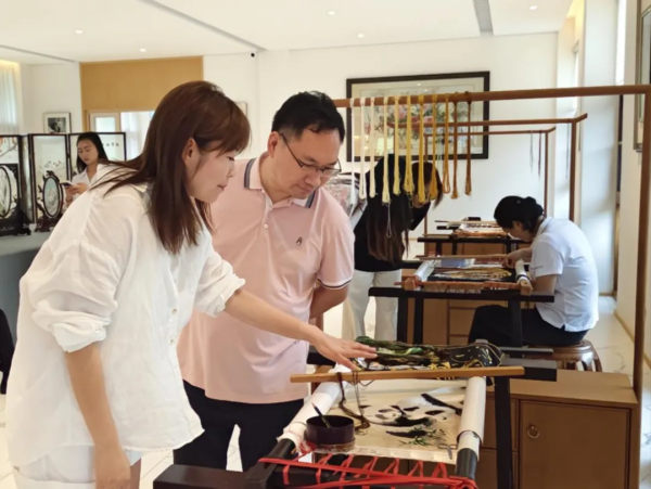魏朋一行來(lái)到了天虹現(xiàn)代蠶業(yè)體驗(yàn)園,在參觀過(guò)程中,薛憶向魏朋副書(shū)記一行詳細(xì)介紹了公司的發(fā)展歷程、產(chǎn)品系列以及未來(lái)發(fā)展規(guī)劃。作為知名的蠶桑企業(yè),天虹絲綢以其精湛的工藝和卓越品質(zhì)贏得了廣泛贊譽(yù)。參觀團(tuán)對(duì)天虹絲綢在傳承與創(chuàng)新方面取得的成就表示高度贊賞,并就如何進(jìn)一步推動(dòng)校企合作、促進(jìn)產(chǎn)學(xué)研一體化發(fā)展進(jìn)行了深入探討。