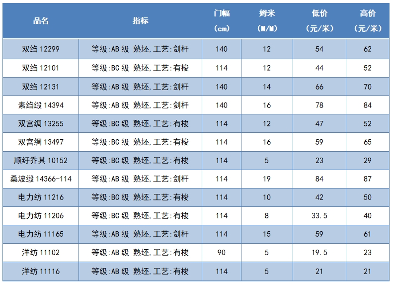本周綢緞指數(shù)協(xié)作單位成交價(jià)格區(qū)間
