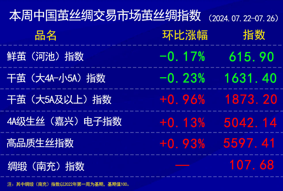 本周鮮繭上市面較少,協(xié)作單位所報(bào)也同步較少。主產(chǎn)區(qū)廣西大部夏伐,少量上市。本周后期發(fā)布高溫預(yù)警,今日將高溫藍(lán)色預(yù)警提升為黃色,全區(qū)大部35~39℃、局地40℃以上,更加影響蠶繭上市產(chǎn)質(zhì)量。本周鮮繭指數(shù)環(huán)比略收綠。