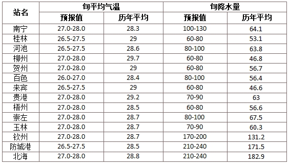 全區(qū)旬平均氣溫、旬降雨量預(yù)報(bào)如下: