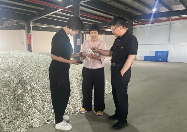 在華佳集團(tuán)董事長王春花女士與副總陳月紅女士的陪同下,訪問團(tuán)隊(duì)首先參觀了規(guī)模化、集約化的云南示范基地,包括收、烘、儲(chǔ)一體化繭站。
