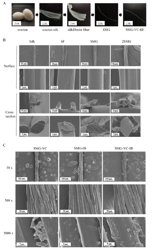本研究通過從蠶絲中提取絲素蛋白纖維制備縫線,如圖1所示,先使用堿性溶液去除蠶絲的絲膠,獲得絲素蛋白纖維(SF),將SF甲基丙烯酸化(SF-MA),然后與GelMA交聯(lián)形成SF-MA-GelMA縫線(SMG)。單鏈SMG的直徑約為15 μm。GelMA涂層使縫線更緊密地聚集,也為IB和VC提供支持和保護(hù),從而使藥物隨著GelMA的降解而釋放。