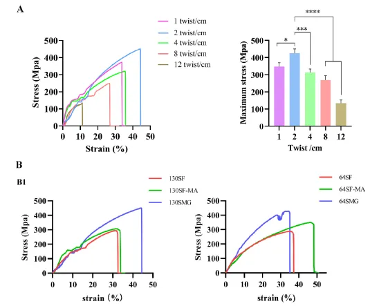 捻度對(duì)縫線的力學(xué)強(qiáng)度有一定的影響。本文選擇130 SMG,每厘米1~12轉(zhuǎn)(T/cm)處理后進(jìn)行測(cè)試,圖2A顯示,捻度為2 T/cm具有較好的強(qiáng)度,斷裂強(qiáng)力可達(dá)17.15 N。圖2B顯示SMG和SMG-VC-IB均獲得了較高的斷裂強(qiáng)度。