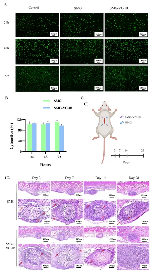 細(xì)胞毒性試驗(yàn)結(jié)果顯示,隨著時(shí)間的推移,成纖維細(xì)胞的數(shù)量急劇增加,SMG、SMG-VC-IB和對(duì)照組之間沒有差異。CCKS試驗(yàn)也顯示,SMG和SMG-VC-IB組保持良好的細(xì)胞活力,揭示SMG和SMG-VC-IB對(duì)細(xì)胞均無毒性。