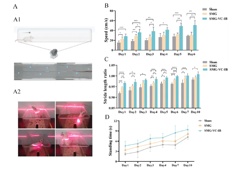 結(jié)果顯示,SMG-VC-IB組創(chuàng)面較空白組和SMG組更早進(jìn)入增值和重塑階段。SMG-VC-IB可減輕炎癥反應(yīng),進(jìn)而減輕疼痛,促進(jìn)創(chuàng)面愈合。通過測(cè)量大鼠的站立時(shí)間,結(jié)果表明站立時(shí)間越短,疼痛越嚴(yán)重。因此,SMG-VC-IB減輕了疼痛。