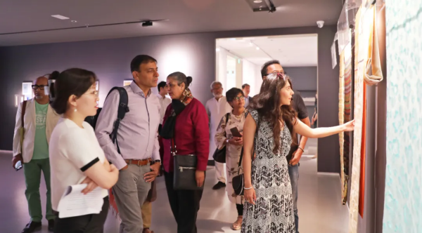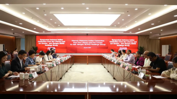 座談交流前,印度文藝界代表團(tuán)一行參觀了蘇豪品牌中心,蘇豪絲綢的工藝之美、匠心之美引得代表團(tuán)一行流連駐足。中國(guó)人民對(duì)外友好協(xié)會(huì)亞非工作部、省外辦民間交流促進(jìn)處、南京傳媒學(xué)院及集團(tuán)黨委宣傳部、蘇豪文化集團(tuán)相關(guān)人員參加活動(dòng)。