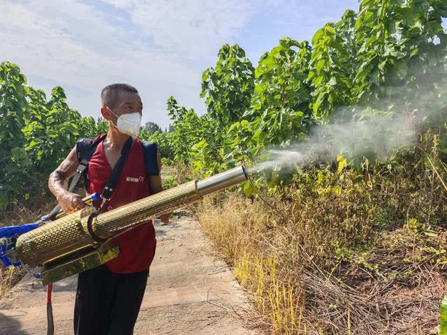 胡中榮忙著給鄰居家的桑樹(shù)施葉面肥