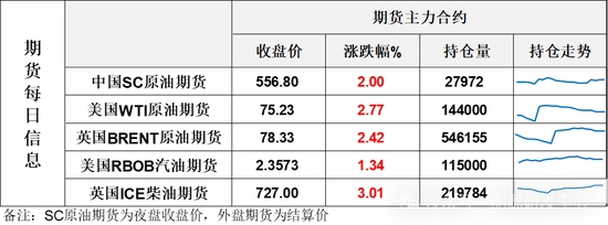 【1】WTI主力原油期貨收漲2.03美元,漲幅2.77%,報(bào)75.23美元/桶;布倫特主力原油期貨收漲1.85美元,漲幅2.42%,報(bào)78.33美元/桶;INE原油期貨收漲2%,報(bào)556.8元。