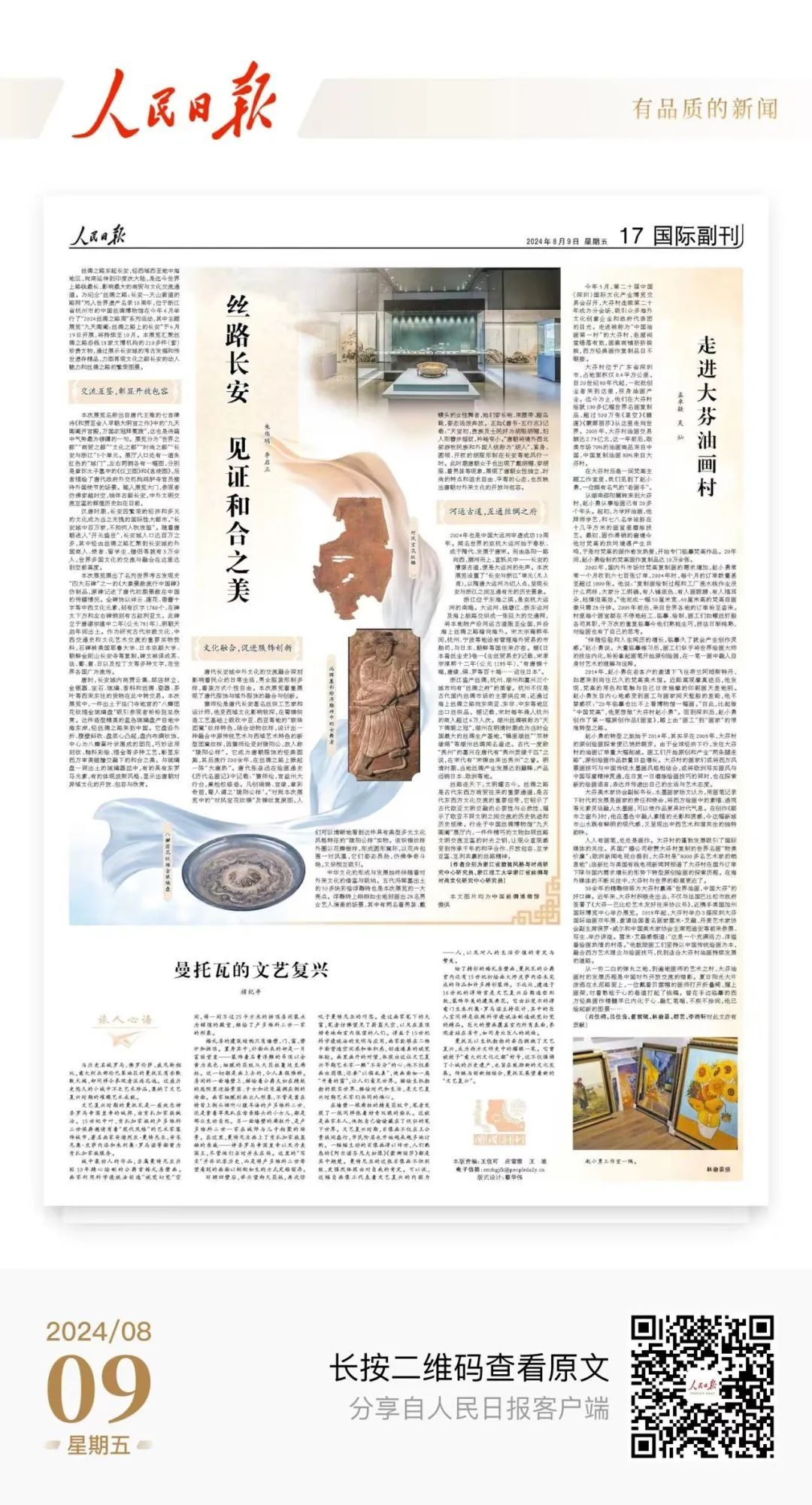 絲路連天下,文明耀古今。絲綢之路是古代東西方商貿(mào)往來的重要通道,是古代東西方文化交流的重要紐帶,它昭示了古代歐亞文明交融的必要性與必然性,揭示了歐亞不同文明之間交流的歷史軌跡和歷史規(guī)律。行走于中國絲綢博物館“九天閶闔”展廳內(nèi),一件件精巧的文物如同絲路文明交流互鑒的時光之鑰,讓觀眾直觀感受到傳承千年的和平合作、開放包容、互學(xué)互鑒、互利共贏的絲路精神。