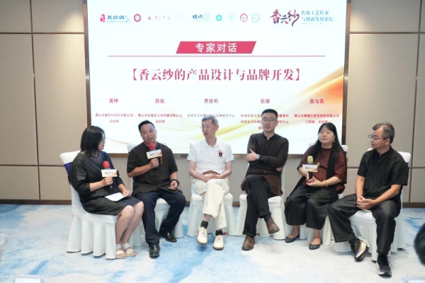 論壇當(dāng)天,佛山大學(xué)設(shè)計(jì)學(xué)院教授文霞還與杭州和佛山優(yōu)秀香云紗企業(yè)家圍繞“香云紗的產(chǎn)品設(shè)計(jì)與品牌開發(fā)”這一主題,就如何推動(dòng)香云紗更好地走向國際、如何推動(dòng)香云紗的文化價(jià)值與現(xiàn)代市場需求相結(jié)合等話題展開討論。杭州東方絲綢文化與品牌研究中心名譽(yù)理事長費(fèi)建明從創(chuàng)辦絲綢企業(yè)、絲綢行業(yè)協(xié)會、絲綢國際組織等親身經(jīng)歷出發(fā),分析了佛山和杭州絲綢產(chǎn)業(yè)的關(guān)鍵發(fā)展問題。論壇發(fā)起人、佛山鍵笙軒紡織有限公司負(fù)責(zé)人黃坤提出,香云紗傳統(tǒng)技藝也應(yīng)與時(shí)俱行,融入更多的現(xiàn)代絲織工藝和先進(jìn)染整技術(shù),更好地促進(jìn)香云紗的傳承與發(fā)展。