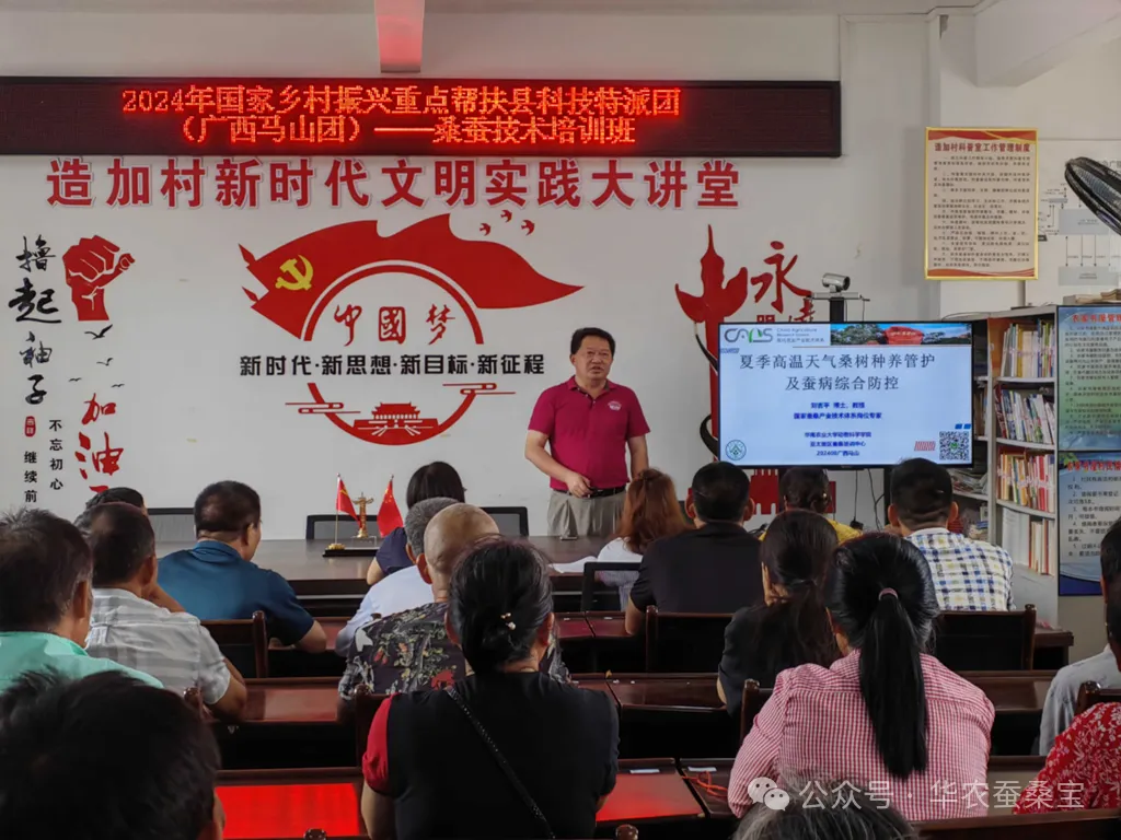 緊接著,劉吉平教授前往馬山縣永州鎮(zhèn)造加村,為村民們帶來了一場以“應對夏季高溫,桑樹種養(yǎng)精細管理及蠶病全面預防”為主題的專業(yè)技術培訓講座。在講座過程中,劉教授系統(tǒng)闡述了桑樹栽培護理的要點、桑樹病蟲害的有效防控策略以及蠶病預防的綜合措施,使與會者受益匪淺。