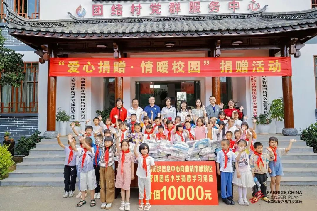 活動當(dāng)天,還舉辦了一場以“愛心捐贈 · 情暖校園”為主題的捐贈儀式。在茨營鎮(zhèn)、盛澤鎮(zhèn)政府領(lǐng)導(dǎo)、紡織產(chǎn)業(yè)鏈企業(yè)家、團(tuán)結(jié)小學(xué)師生們的現(xiàn)場見證下,中國紡織信息中心向曲靖市麒麟?yún)^(qū)茨營鎮(zhèn)團(tuán)結(jié)小學(xué)捐贈了價值1萬元的書包、水杯、文具等學(xué)習(xí)用品共計60套。