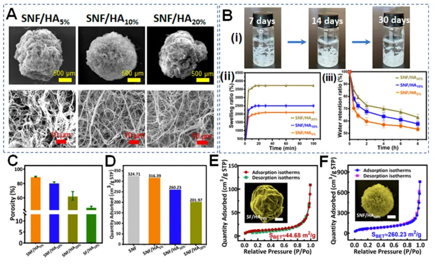 微球在水中表現(xiàn)出很高的穩(wěn)定性,即使在PBS中浸泡30天后也是如此。微球的膨脹率和保水率隨著HA含量的增加而增加,這歸因于HA的超親水性。透明質(zhì)酸的引入大大提高了SNF微球的親水性和水結(jié)合能力,有利于微球作為細胞載體和支架。相反,隨著HA含量的增加,孔隙率和比表面積顯著降低,因為HA占據(jù)了納米纖維之間的空間。綜上所述,含10% HA的微球為作為后續(xù)實驗的優(yōu)化組。SNF/HA10%微球的比面積比SF/HA10%微球增加了5倍以上,表明SNF/HA10%微球在用作細胞載體或組織工程支架時具有潛在的高吸附性和負載能力。