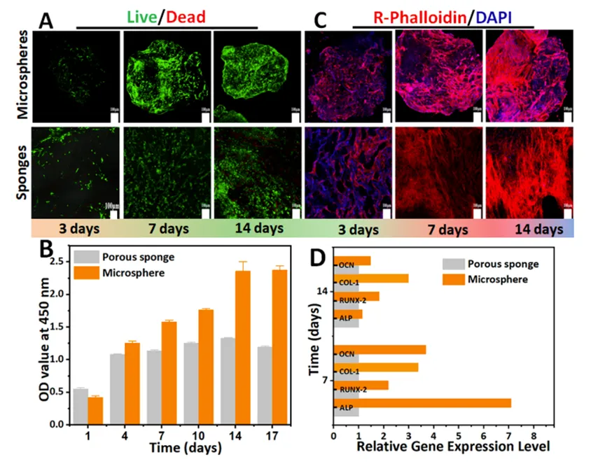 研究了骨髓間充質(zhì)干細胞(BMSCs)在SNF微球上的增殖情況,并將其與含10% HA的再生SF海綿進行了比較。微球和多孔海綿均支持干細胞的長期生長和持續(xù)增殖。有趣的是,SNF微球上的細胞活力值高于多孔海綿,表明SNF微球具有更好的細胞相容性。進一步,在微球上評估骨髓間充質(zhì)干細胞的成骨分化行為。SNF微球和多孔海綿均能支持成骨分化誘導下的細胞生長骨特異性標記物的表達,成骨標志物ALP、Runx2.Col和OCN這些基因在第7天SNF微球上的表達水平高于多孔海綿,表明SNF微球?qū)Τ晒欠只恼T導作用增強。