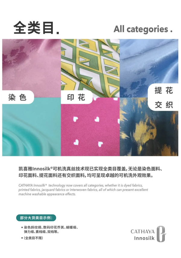 凱喜雅Innosilk?可機(jī)洗真絲技術(shù)現(xiàn)已實(shí)現(xiàn)全類目覆蓋,無論是染色面料、印花面料、提花面料還有交織面料,均可呈現(xiàn)卓越的可機(jī)洗外觀效果。已大貨面料包含染色斜紋綢、數(shù)碼印花喬其、蝴蝶緞、彈力緞、素縐緞、雙縐等類目。全類目不限。