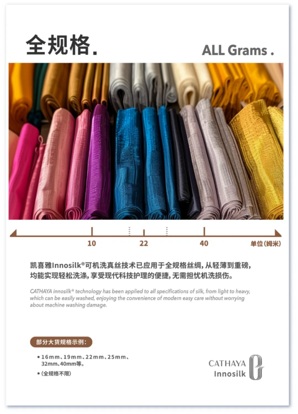 凱喜雅Innosilk?可機(jī)洗真絲技術(shù)已應(yīng)用于全規(guī)格絲綢,從輕薄到重磅,均能實(shí)現(xiàn)輕松洗滌,享受現(xiàn)代科技護(hù)理的便捷,無需擔(dān)憂機(jī)洗損傷。已大貨規(guī)格包含16mm、19mm、22mm、25mm、32mm、40mm等。全規(guī)格不限。