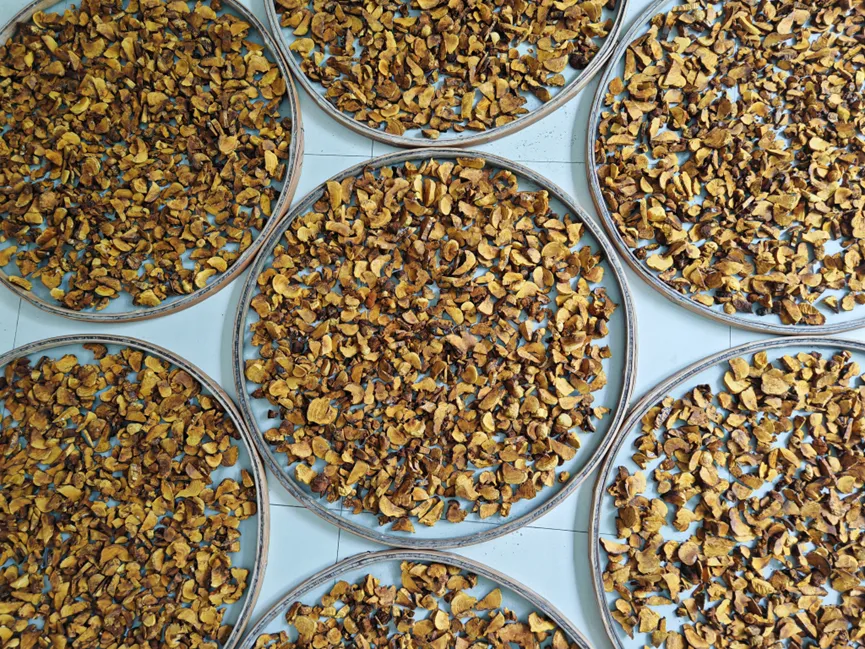 八月,溫室大棚里栽種的一種神奇的黃棕色菌類進(jìn)入收獲季節(jié)。在位于吳興區(qū)市農(nóng)科院蠶??蒲猩a(chǎn)基地里,技術(shù)人員正和工人們一起有條不紊地忙碌著,采摘、清理、分類、切片、取樣、低溫烘干,試驗(yàn)種植的桑黃樣品暫時(shí)放入冷凍冰柜保存。