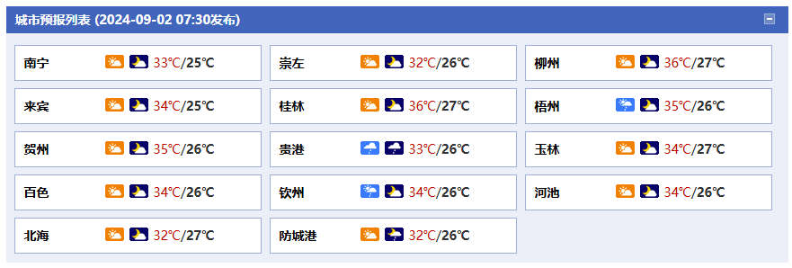 南寧市:今天白天到晚上,多云、局地有陣雨或雷雨,偏東風1~2級,最高氣溫34℃,最低氣溫26℃。