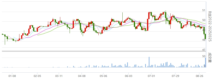 今日(2024年09月02日,周一)中國繭絲綢交易市場(chǎng)生絲電子指數(shù)下跌1.39%報(bào)收于4839.89點(diǎn)。B絲2022D(商檢4A級(jí)生絲):240925合約下跌0.63萬元報(bào)收于48.78萬元;250325合約下跌0.51萬元報(bào)收于48.24萬元;250925合約下跌0.45萬元報(bào)收于47.67萬元。