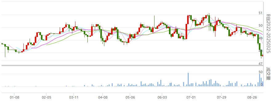 今日(2024年09月04日,周三)中國繭絲綢交易市場生絲電子指數(shù)微跌0.09%報收于4785.44點。B絲2022D(商檢4A級生絲):240925合約上漲0.15萬元報收于48.09萬元;250325合約上漲0.06萬元報收于47.82萬元;250925合約上漲0.03萬元報收于47.19萬元。